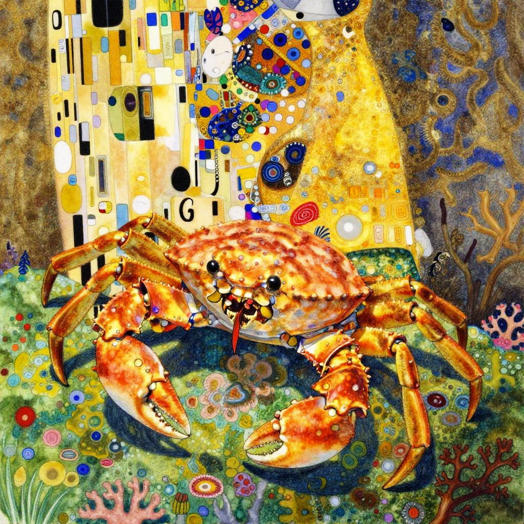 A dancing golden harlequin crab, legendary and magical, set in sunlit coral reef, inspired by Yoshitaka Amano, Linda Bergkvist, Gustav Klimt, vibrant colors, highly detailed with watercolored pencil texture.