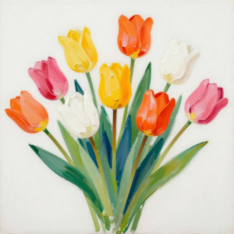 The image presents a striking abstract minimalist expressionist art piece featuring a vibrant bouquet of tulips against a stark white background. The tulips, rendered with bold, expressive brushstrokes, exhibit a range of colors including shades of orange, yellow, pink, and white. The paint strokes are thick and textured, adding depth and a sense of movement to the composition. The flowers are arranged in a loose, naturalistic manner, with some buds closed and others fully bloomed, creating a dynamic interplay of shapes and forms. The green leaves and stems, painted with a similar textured style, provide a grounding element that contrasts with the bright hues of the tulips. The overall composition is balanced yet lively, with the flowers and leaves occupying the central and peripheral areas of the frame, drawing the viewer's eye across the entire artwork. The use of oil paint is evident in the rich, luminous quality of the colors and the visible brushwork, enhancing the tactile and emotional impact of the piece.