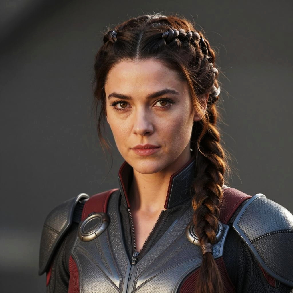 Close-up portrait of a woman wearing a textured and futuristic Mockingjay-inspired costume. She has brown hair styled in an intricate braid and displays a strong, confident expression. The outfit features structured shoulder armor with circular metallic details and a zippered front in dark tones with red accents.