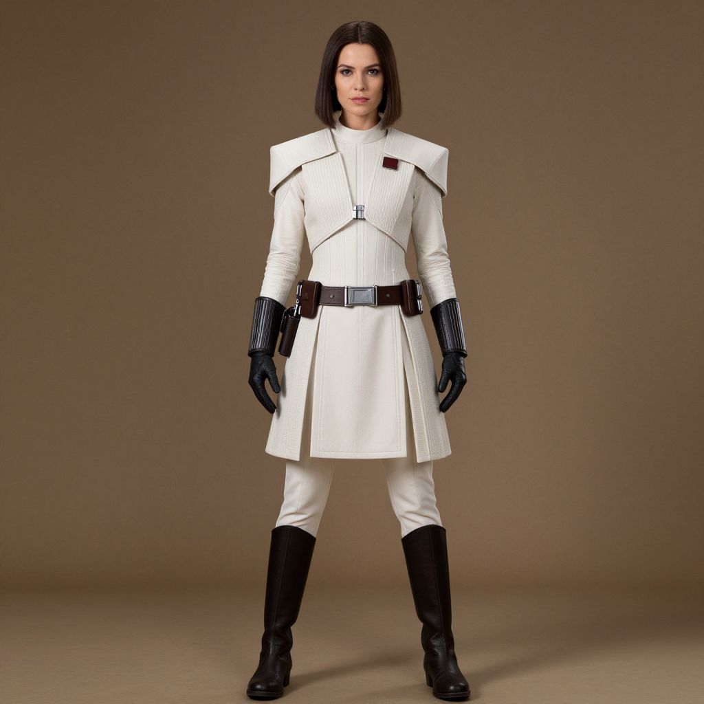 Photograph of a woman standing against a plain, brown background. She has fair skin, straight brown hair cut to shoulder length, and a serious expression. She wears a white, military-style coat with black accents, black gloves, white pants, and black knee-high boots. The coat has a high collar, black lapels, and a black belt with a silver buckle. The outfit is formal and structured, evoking a futuristic or military aesthetic. She stands with her hands by her sides, feet slightly apart. The lighting is even, highlighting the crisp lines and clean design of her attire.