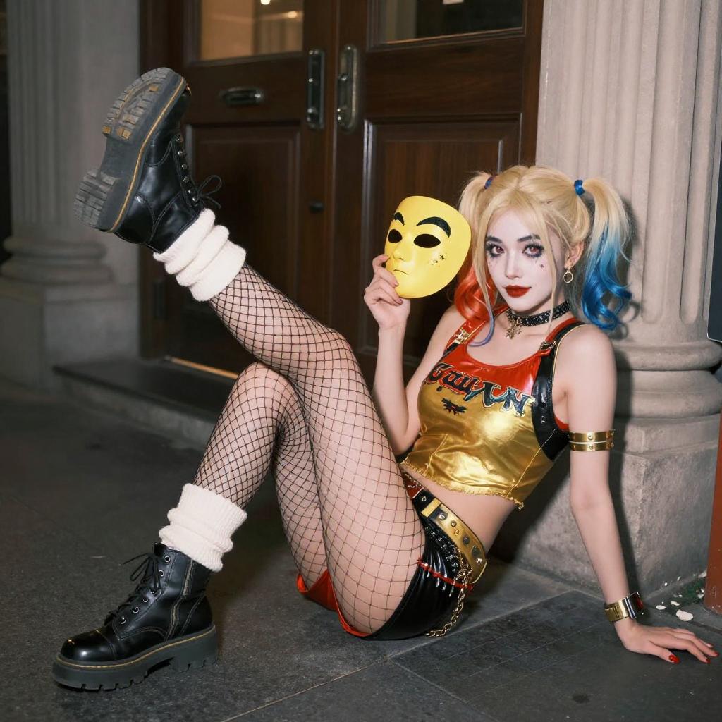 Photograph of a blonde woman in a yellow and black Harley Quinn cosplay, with pigtails, fishnet stockings, and a black leather top, sitting on a man's lap. The man, with a blurred face, wears a black t-shirt and watch. They are in a dimly lit room with wooden walls and a window in the background.