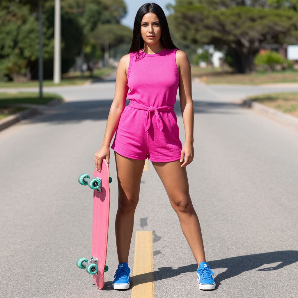Woman standing confidently on a sunlit road, wearing a vibrant pink sleeveless romper tied at the waist, paired with bright blue sneakers, while holding a matching pink skateboard with teal wheels.