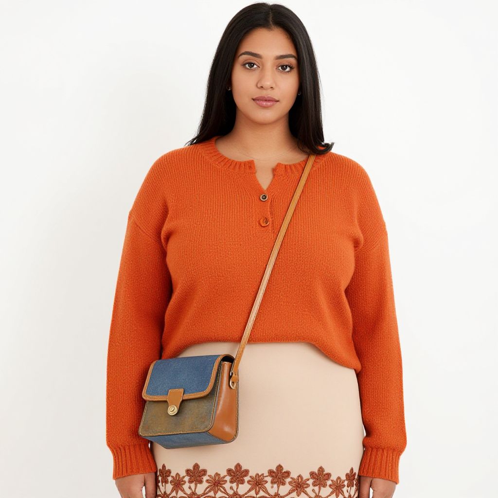 "Woman, casual contemporary, burnt orange textured sweater, button detailing at the front, round collar, long sleeves, layered over a beige slip dress with brown floral hem embroidery, crossbody bag in blue and tan worn around the waist, white background with minimal shadow.. Sexy. Pretty face and beаutiful eyes. Big breasts."