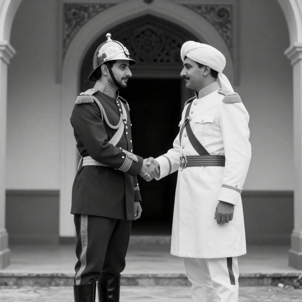 Black-and-white photograph of two men in historical military uniforms shaking hands. The man on the left wears a dark coat with intricate embroidery, a white helmet, and black boots. The man on the right wears a white coat with dark trim, a white turban, and white pants. They stand in front of an ornate, arched doorway.