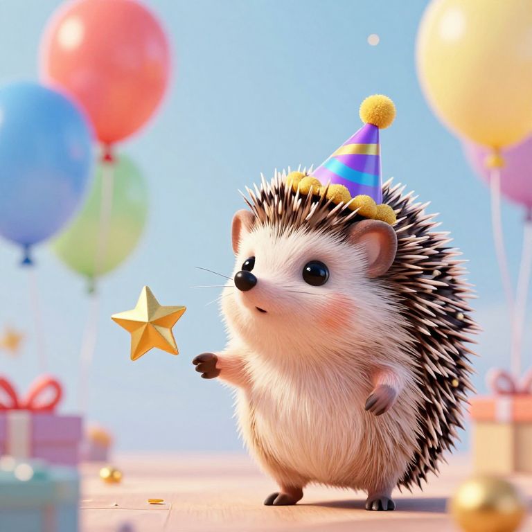 Amidst a whimsical celebration, the party hedgehog radiates joy and wonder, its spiky form adorned with a festive hat, while vibrant balloons and a golden star dance in the air, symbolizing the boundless spirit of festivity and the timeless magic of simple pleasures.