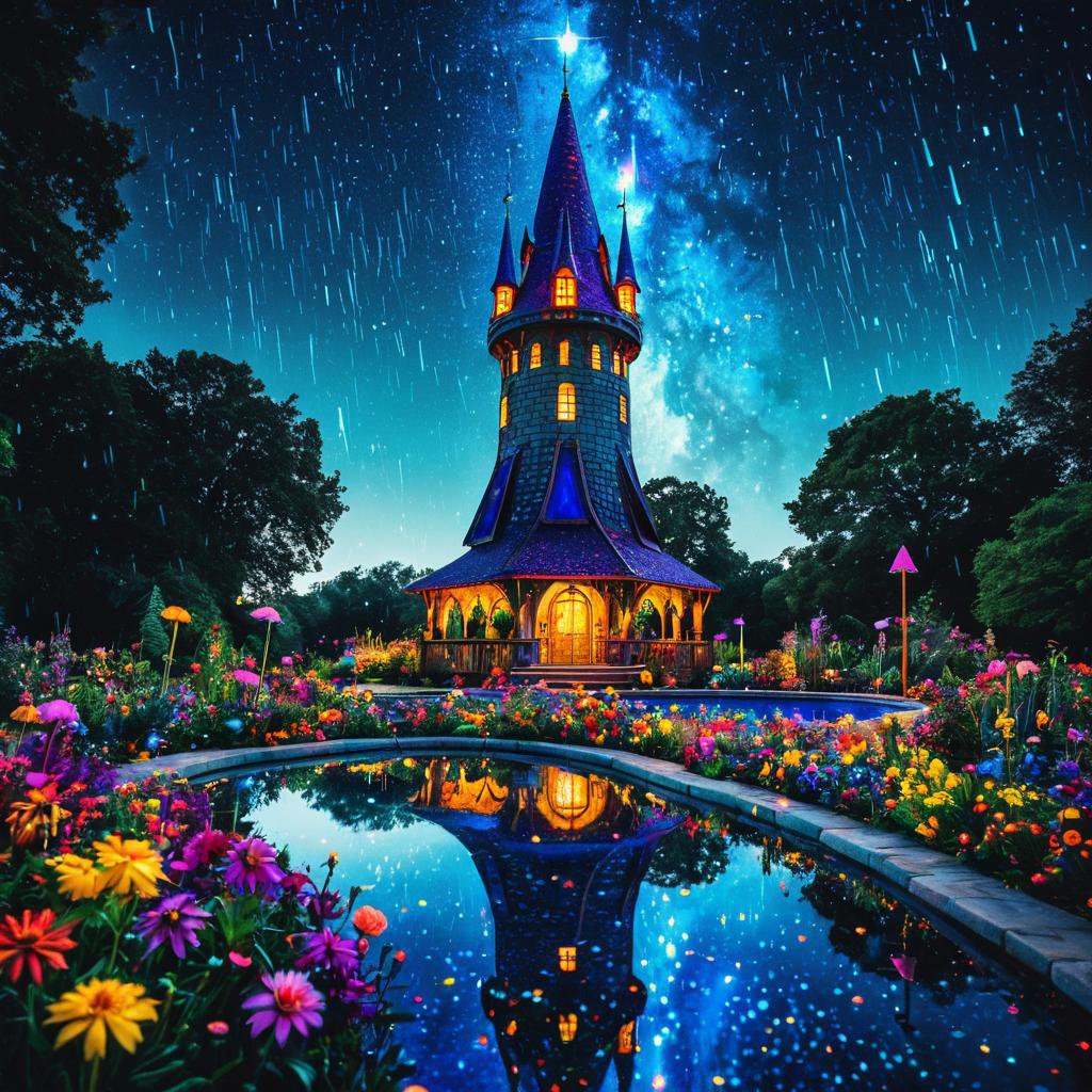 A fantastical wizard tower illuminated warmly at night, surrounded by vibrant, colorful enchanted flowers and lush greenery. The scene features a reflective magical pool in front of the tower mirroring its glowing windows, under a starry sky with a vibrant comet rain effect, evoking an ethereal and mystical fairy-tale atmosphere.