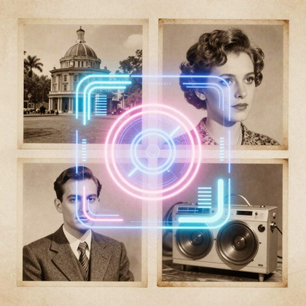 Combine images AI fusing vintage photography with futuristic holographic elements, soft sepia tones meeting bright neon glows, nostalgic yet futuristic vibe, textured layers, mixed media look, detailed compositions, artistic contrast between eras.