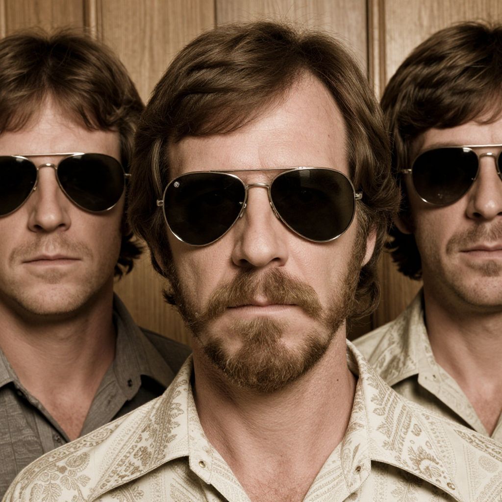 Close-up portrait featuring 70's facial hair styles, including handlebar mustaches and mutton chops, on men wearing vintage aviator sunglasses and patterned shirts, wood-paneled backdrop, warm sepia tones, highly detailed hair textures and skin pores, classic 70s vibe.