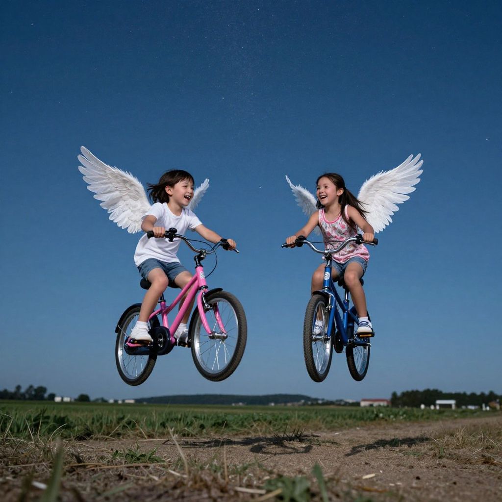 A child adorned with golden wings gracefully pedals a bicycle through a starlit cosmos, soaring above clouds and navigating a celestial realm where dreams and wonder intertwine.