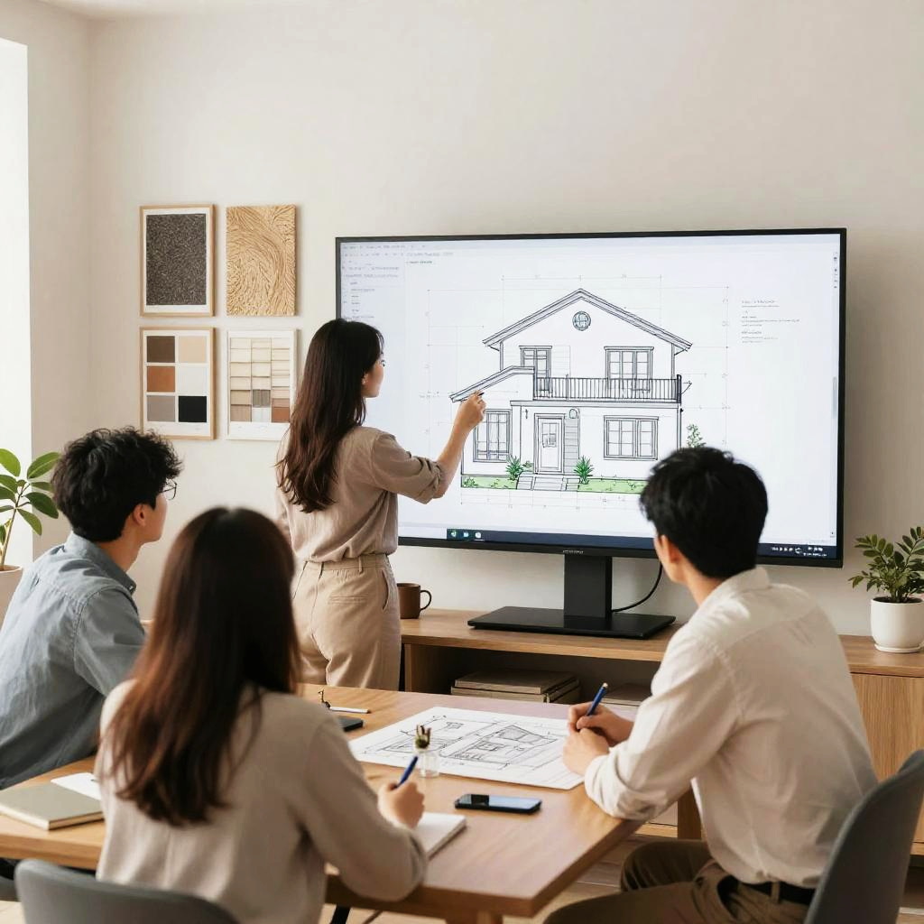 House blueprint creator collaborating with clients in a bright workspace, large screens showcasing detailed home plans, mood boards with textures and materials on walls, cozy atmosphere blending technology and creativity, emphasizing teamwork in crafting perfect house designs.