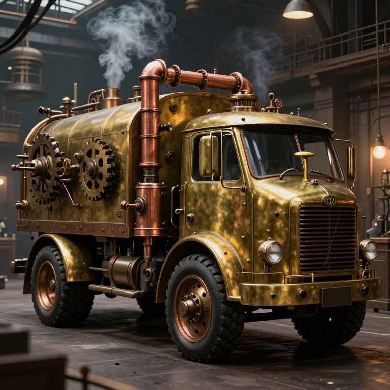 Steampunk style truk with brass and copper elements, steam pipes and gears visible, set in a Victorian era industrial workshop, warm lighting with smoke effects, intricate mechanical details, imaginative and artistic.
