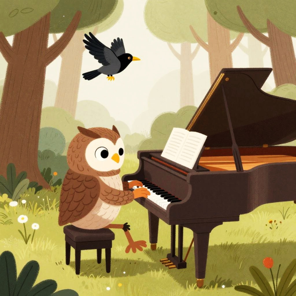 Owl playing a grand piano and crow fluttering in a whimsical forest setting, playful and musical, illustrated in a charming style