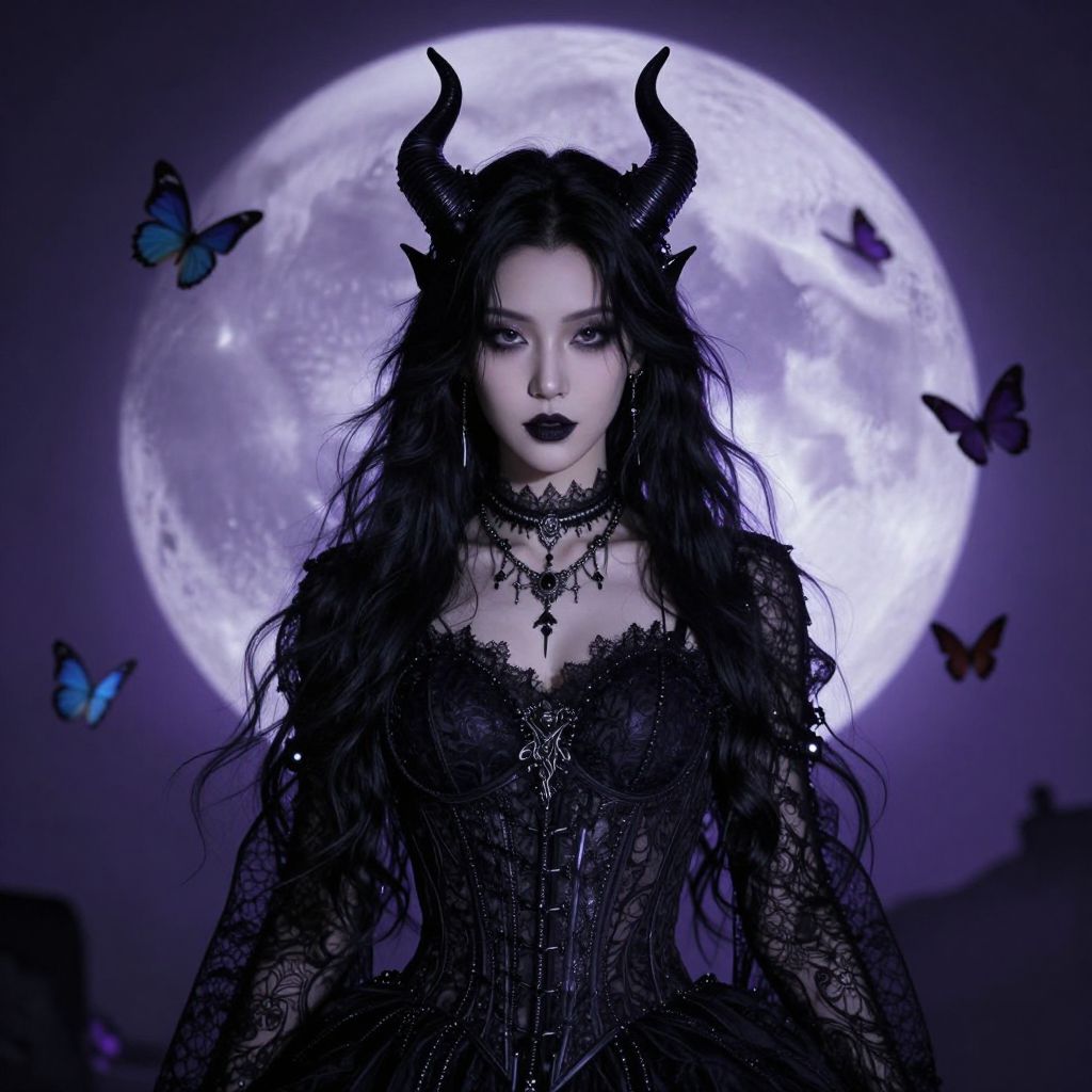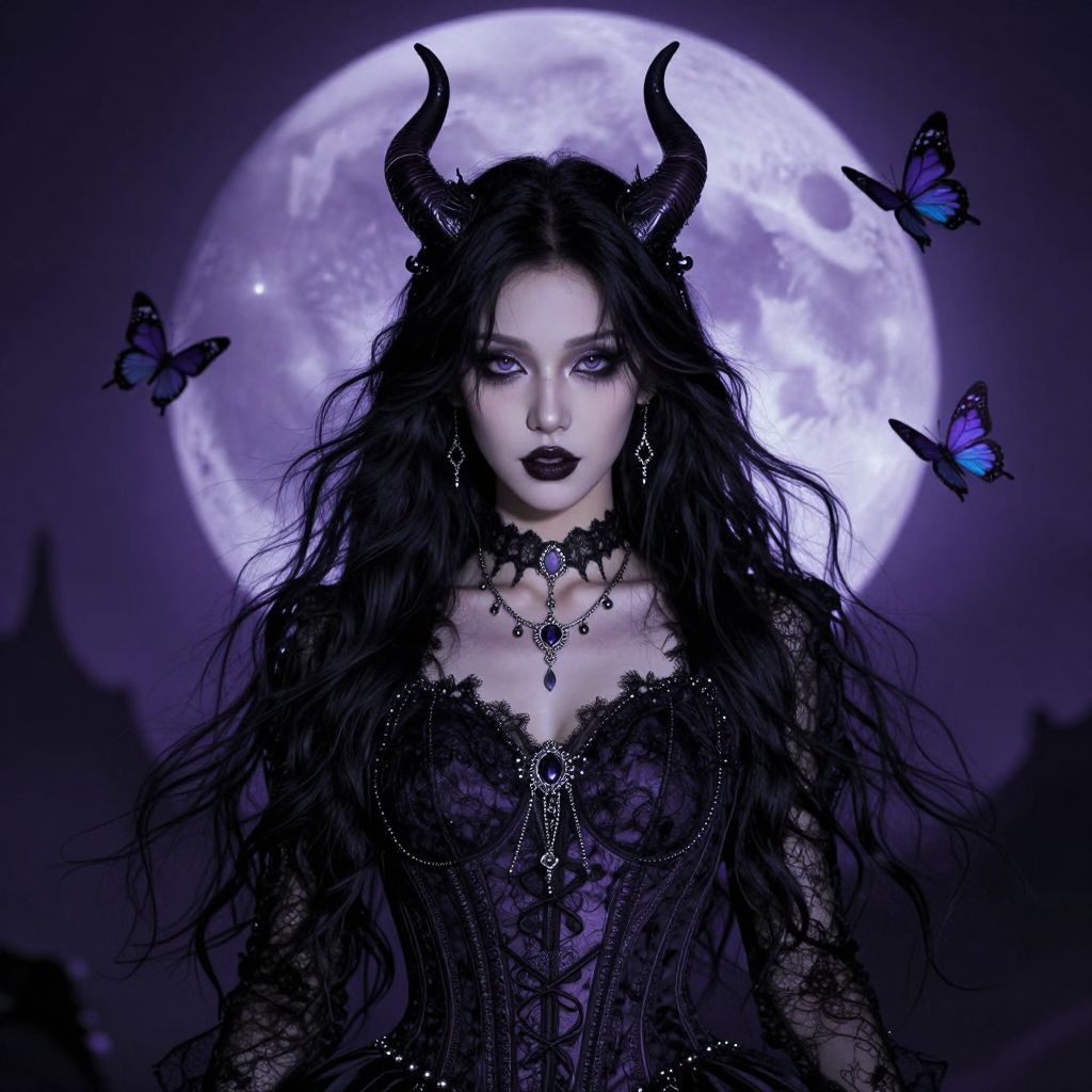 A gothic fantasy woman with long black hair, adorned with devil horns and intricate lace attire, stands against a dramatic purple moonlit backdrop, surrounded by fluttering butterflies, rendered in a high-definition digital art style.