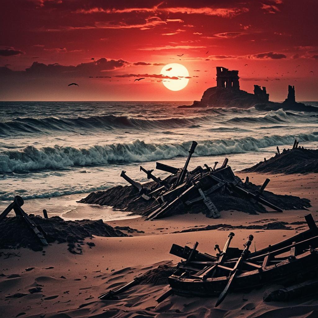 A haunting and mysterious deserted ancient battlefield on a sandy shore under a dramatic red sunset sky. Broken swords and weapons are scattered across the sand, with ocean waves gently lapping nearby. Ruined structures stand silhouetted against the setting sun, adding to the eerie and somber atmosphere.