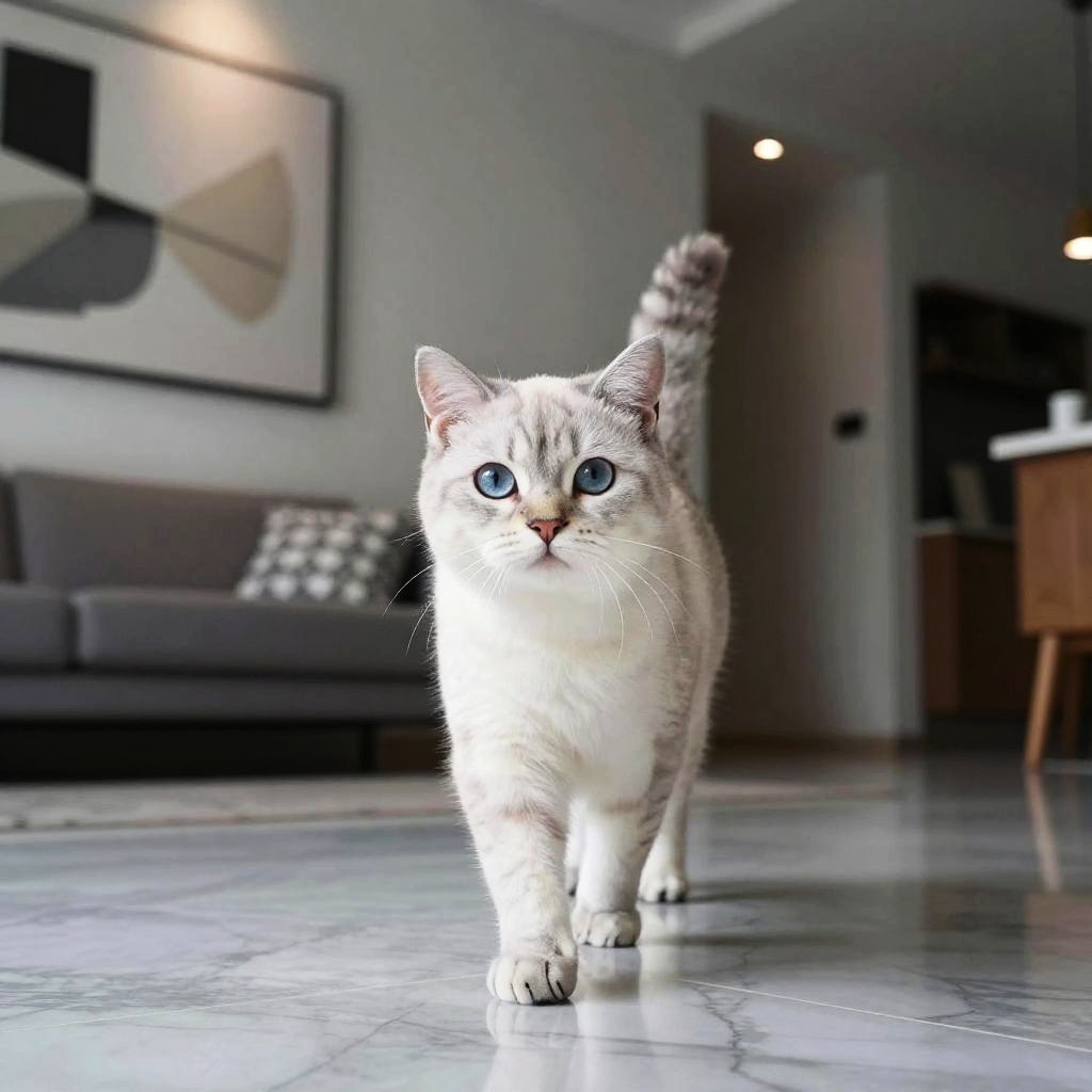 Regal silver British Shorthair cat with piercing blue eyes confidently walking toward the viewer across sleek modern living room with marble floors and abstract art, lit by cool recessed lighting casting subtle highlights. Natural textures of fur, fabric, and wood emphasized; inviting and homey atmosphere; shallow depth of field; crisp whiskers; soft vignetting; balanced composition; subtle film grain; realistic color rendering; gentle contrast; fine detail throughout.