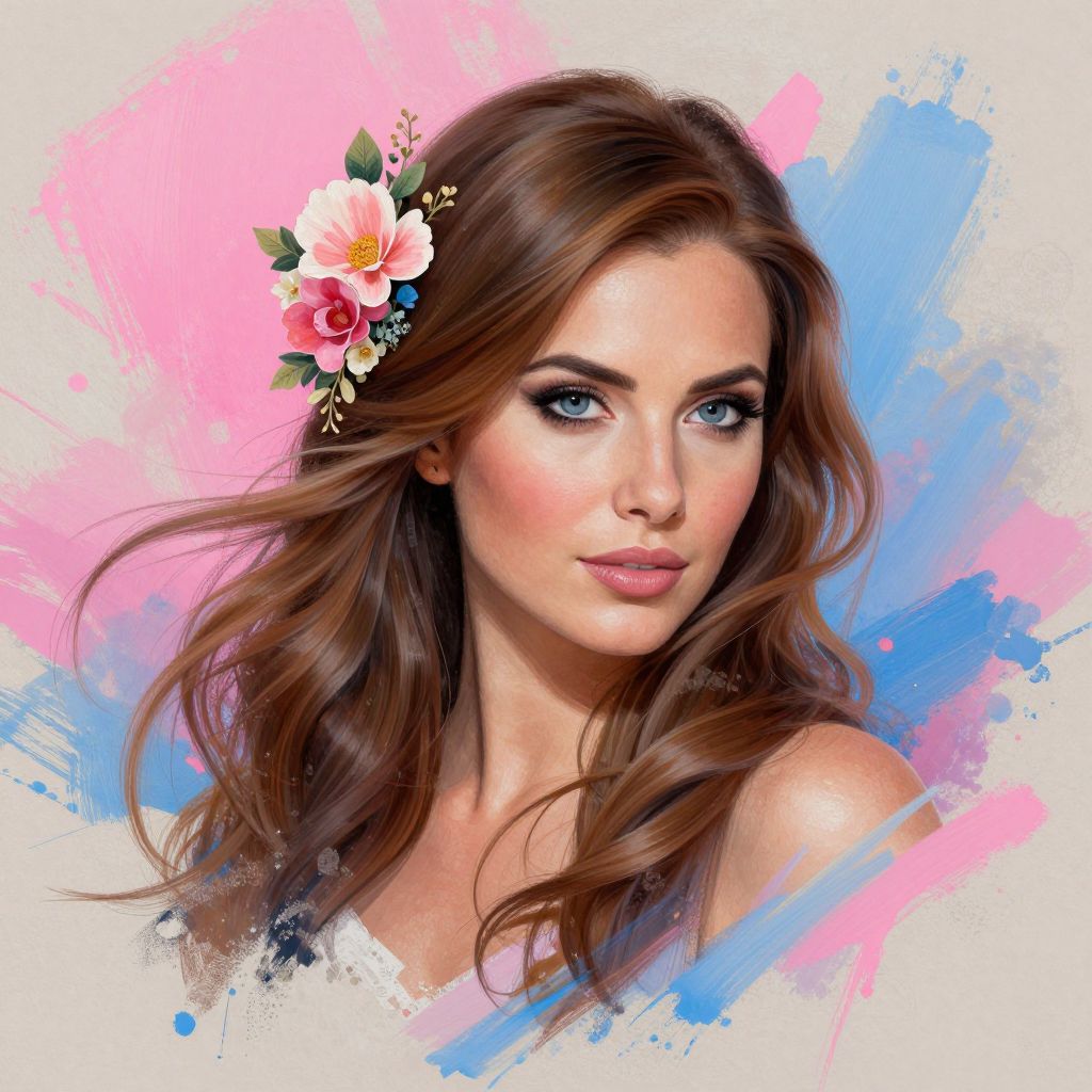 A stunning illustration of a woman with long, flowing hair, set against a lush botanical background. Her captivating gaze and gentle expression evoke a sense of serenity and beauty, highlighting the intricate details and vibrant colors of the artwork.