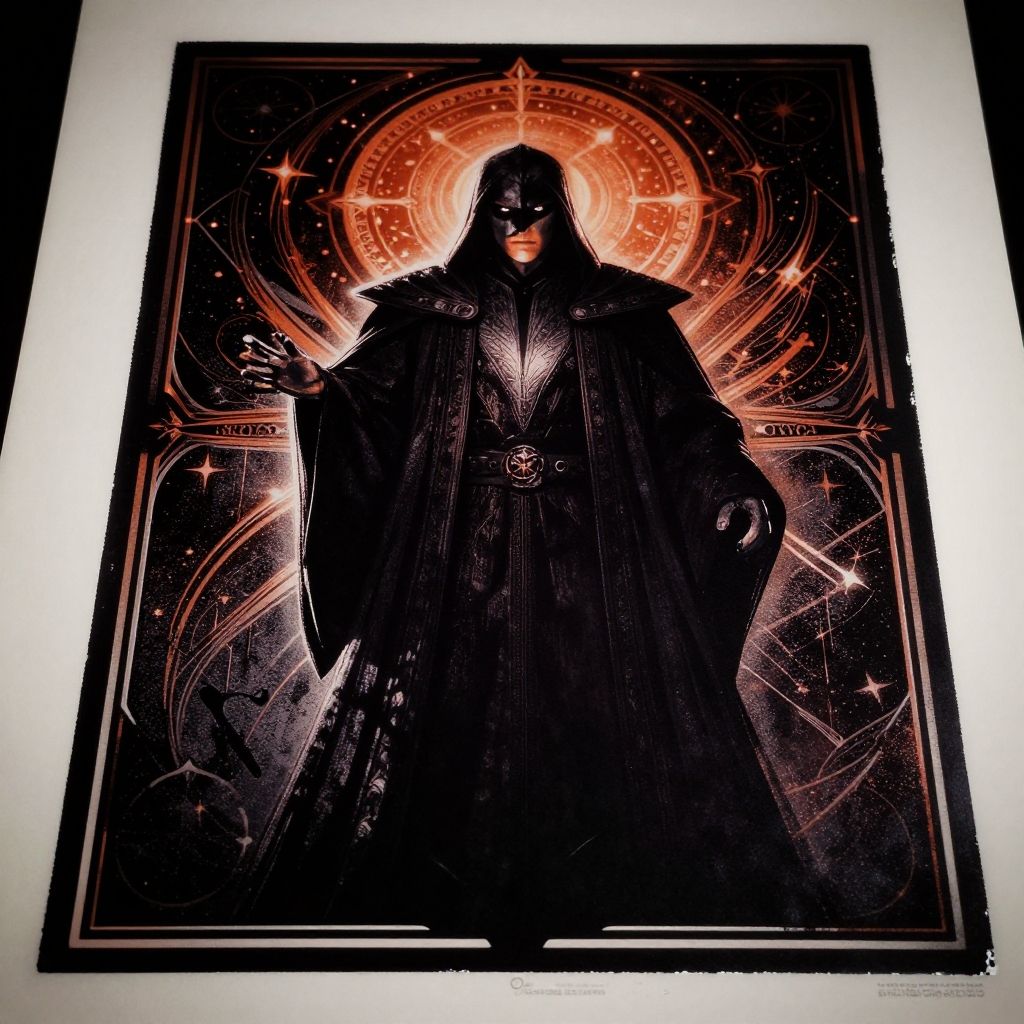 Photograph of a dark, detailed, sci-fi styled poster featuring a shadowy figure in a black hooded robe with a glowing red halo and intricate