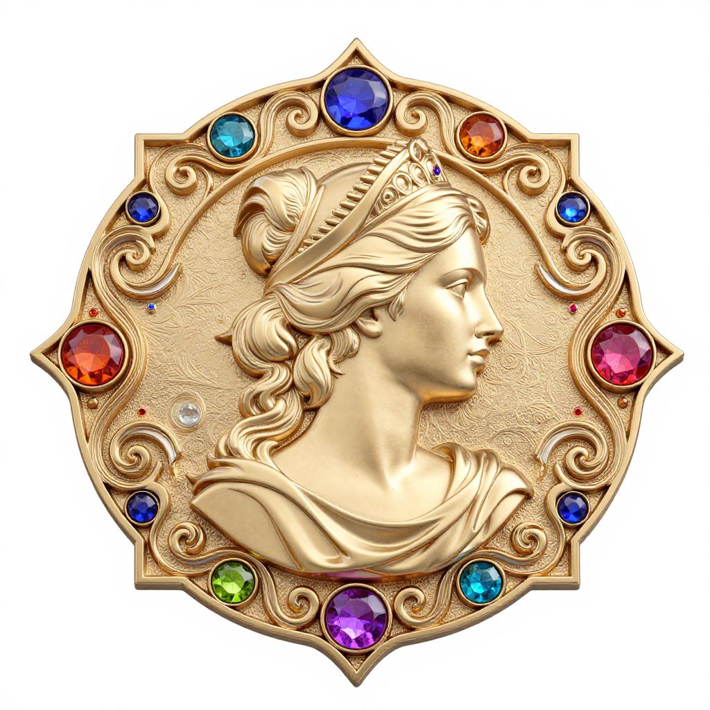 A detailed 3D-rendered medallion featuring a profile portrait of a woman adorned with intricate swirls and embellished with vibrant gemstones, showcasing a blend of classical and fantasy-inspired design elements.