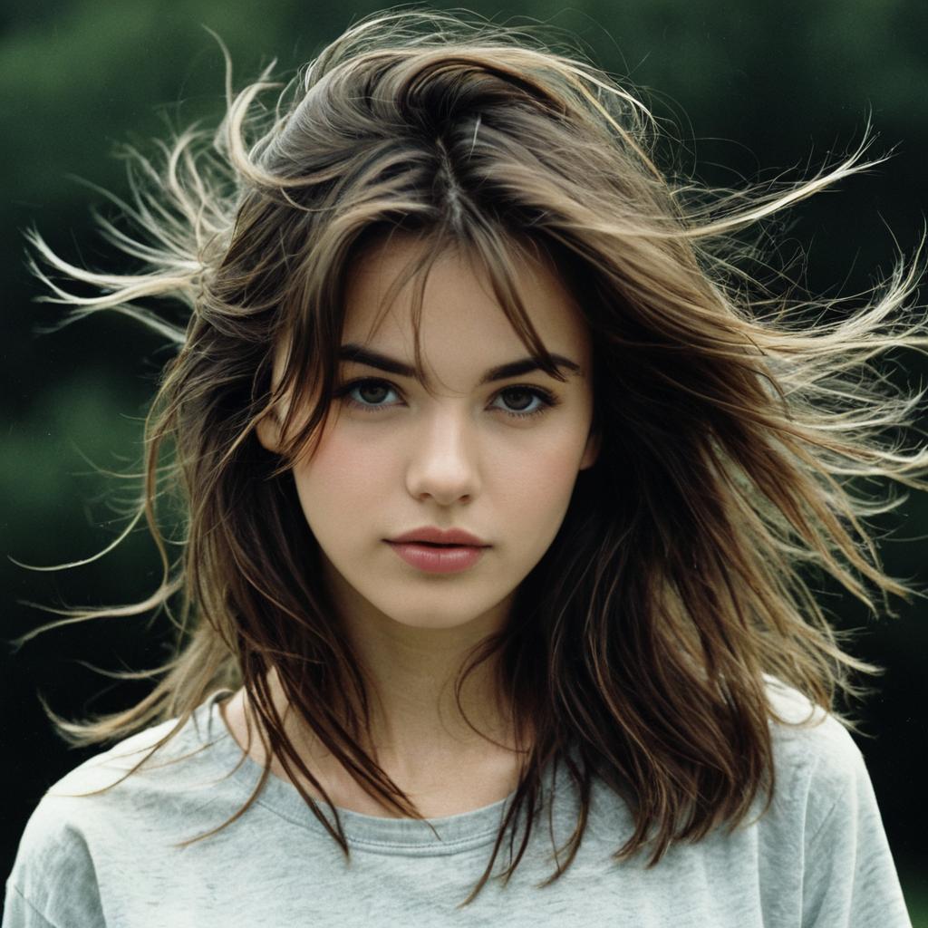 Windswept hair hairstyle,1girl, solo, messy hair, long hair, brown hair, realistic, lips, looking at viewer, upper body, shirt