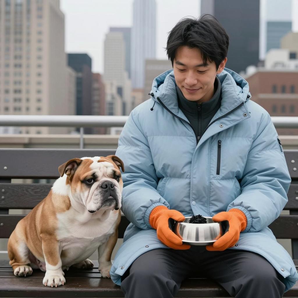 Young Asian man with short black hair wearing a light blue puffy coat and bright orange gloves sits on a black bench holding a silver bowl with a black object. Next to him sits a brown and white bulldog with a white patch around its eyes. Cityscape with tall buildings in the background on an overcast day.