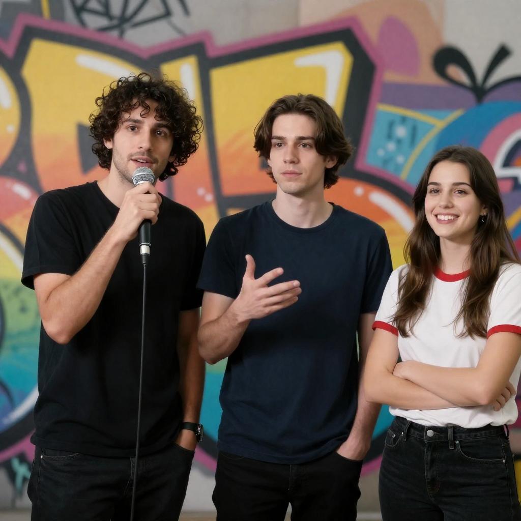 Photograph of three people standing against a colorful, graffiti-covered background. Two males, one with curly hair in a black shirt, holding a microphone, and another with straight hair in a dark shirt, gesturing with his hand. Female on the right with long brown hair, white and red shirt, smiling with arms crossed. Bright, vivid colors in the background.