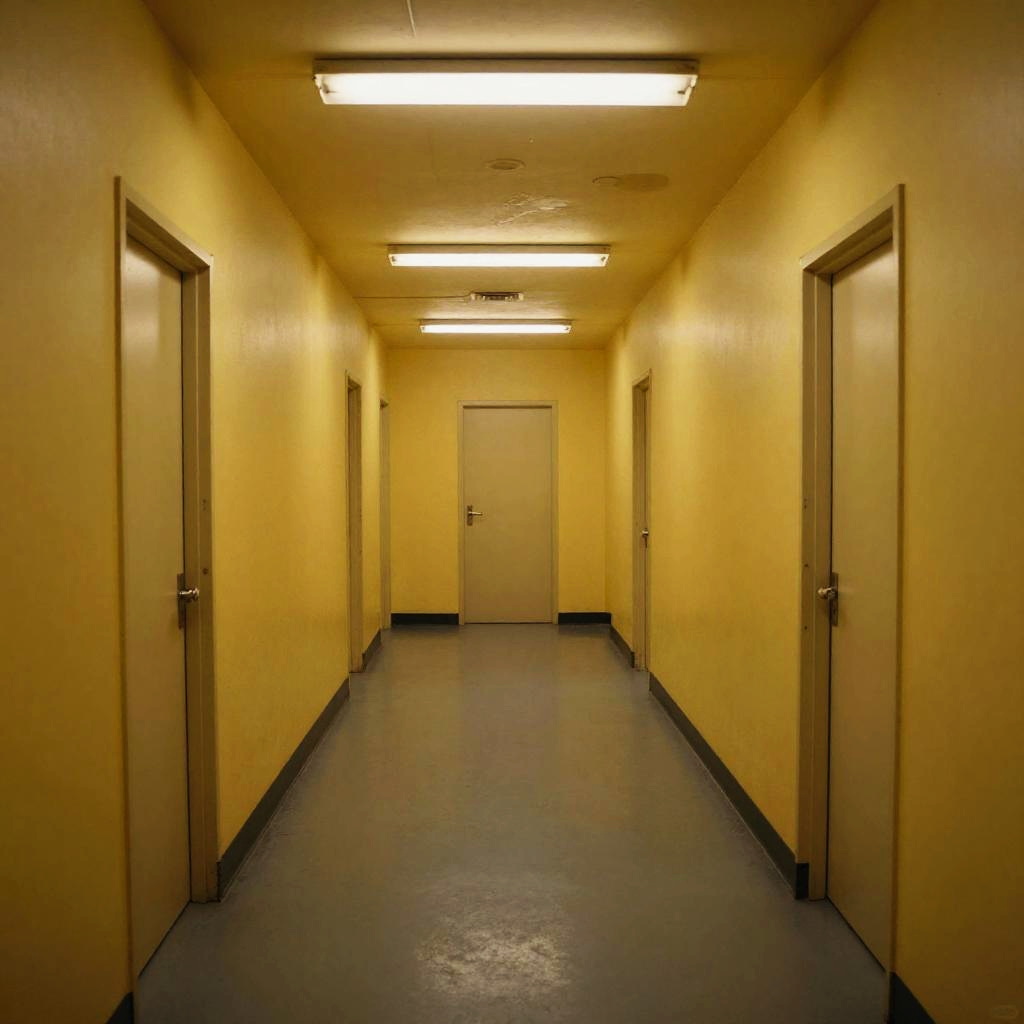 Why are backrooms scary: eerie endless yellow halls, flickering fluorescent lights, unsettling silence, missing doors, subtle shadows lurking, surreal empty office space, claustrophobic atmosphere