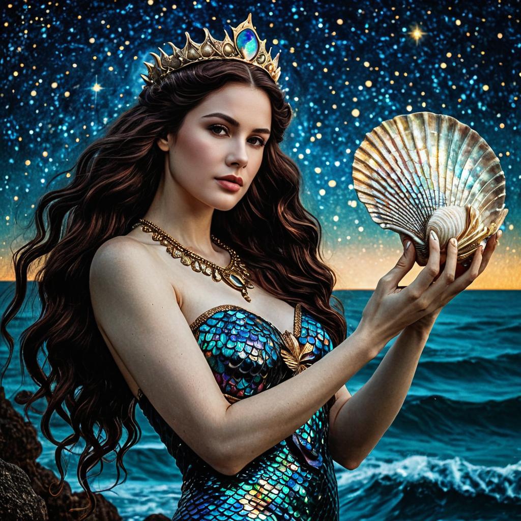 A realistic portrait of a celestial mermaid queen with long wavy dark hair, wearing an iridescent scale-patterned dress and a golden crown with a large blue gem. She holds a large conch shell with both hands against a starry night sky and ocean backdrop. The detailed fantasy image is inspired by works of John William Waterhouse and Gustav Klimt.