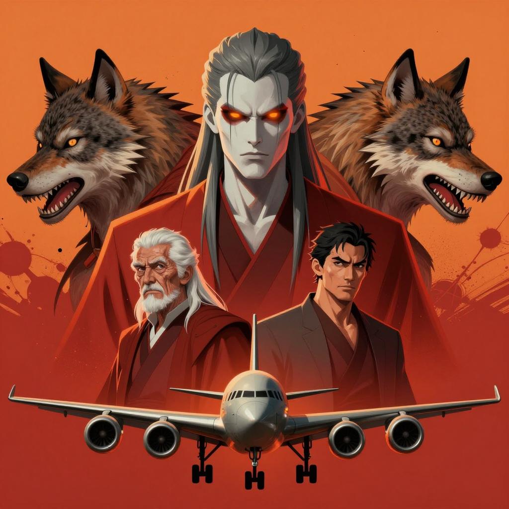 Digital illustration of four male figures with intense expressions. Central figure with pale skin, gray hair, and glowing orange eyes, wearing a red robe. Two werewolf-like creatures with snarling faces on left and right. Smaller elderly man with white hair and red robe below central figure. Aircraft with cross-shaped fuselage at bottom center. Bright orange and red background with splattered ures.