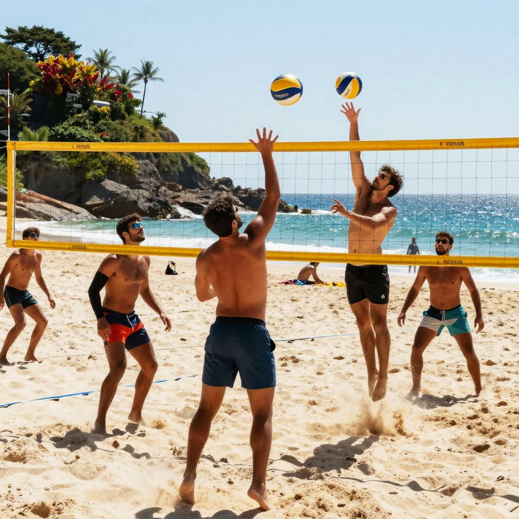 Shirtless college men playing beach volleyball, dynamic action poses, sunny day with clear blue sky, sandy beach setting, youthful energy, realistic details and textures