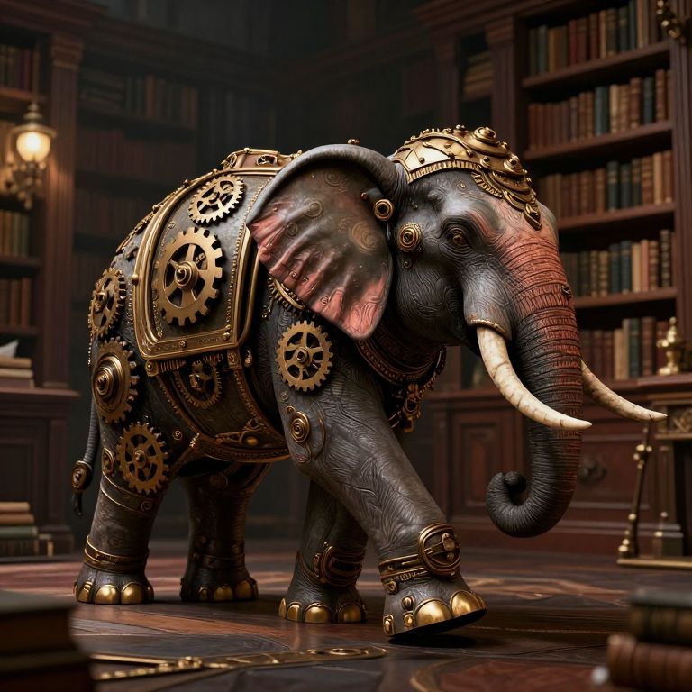 Digital artwork of a steampunk elephant with brass gears and cogs, standing in a dimly lit, wooden library. The elephant's dark gray
