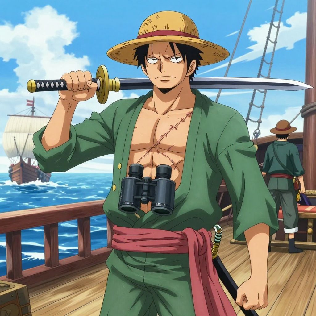 One piece bald guy standing on the deck of a pirate ship, wearing a ragged vest and bandana, with a confident smirk, vibrant anime style, detailed ocean background, bright colors, dynamic pose, high contrast lighting.