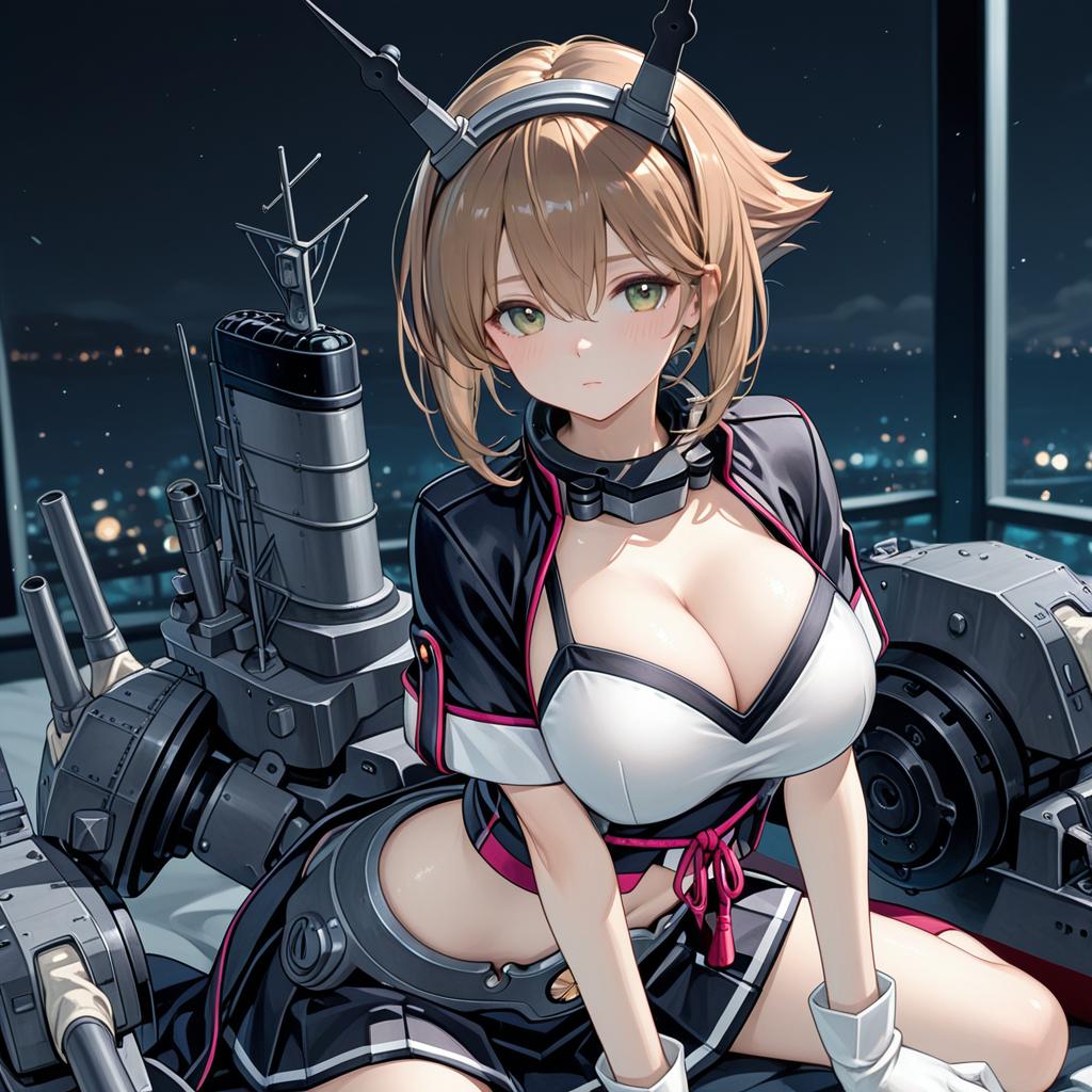 This digital anime-style illustration features a cute, young woman with light brown, short, wavy hair and green eyes, wearing a revealing black and white sailor-inspired outfit with a low-cut top that accentuates her large breasts. She has a headband with black horns and is kneeling on a dark, metallic surface. Her outfit is adorned with red accents and she has a black choker around her neck. Behind her are large, mechanical gun turrets with intricate details. The background is a nighttime cityscape visible through a window, with blue and white lights dotting the distant horizon. The overall aesthetic is futuristic and military-themed.