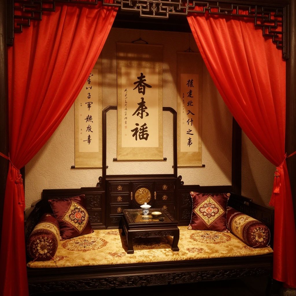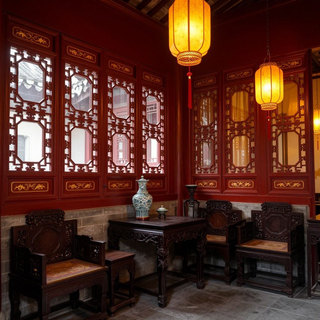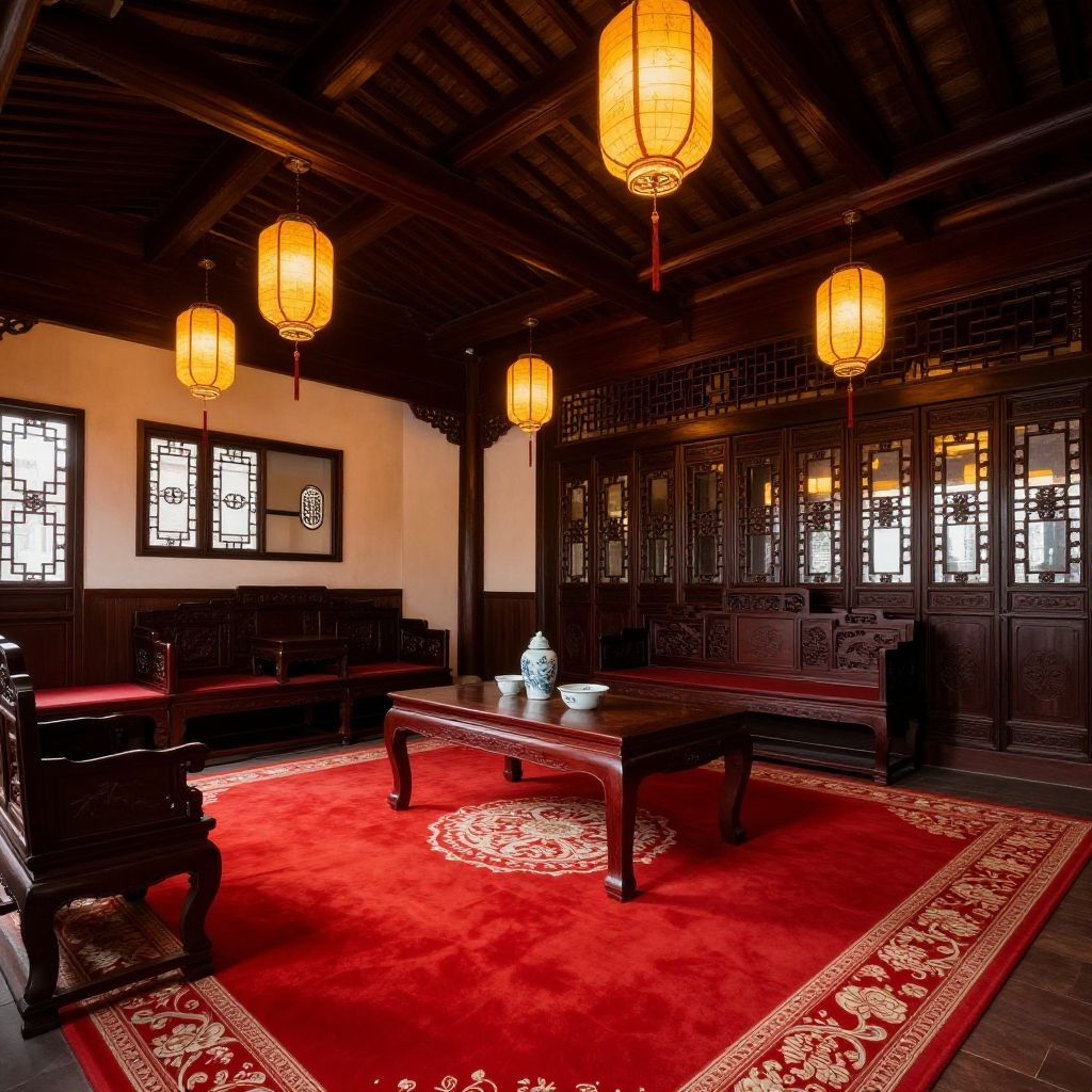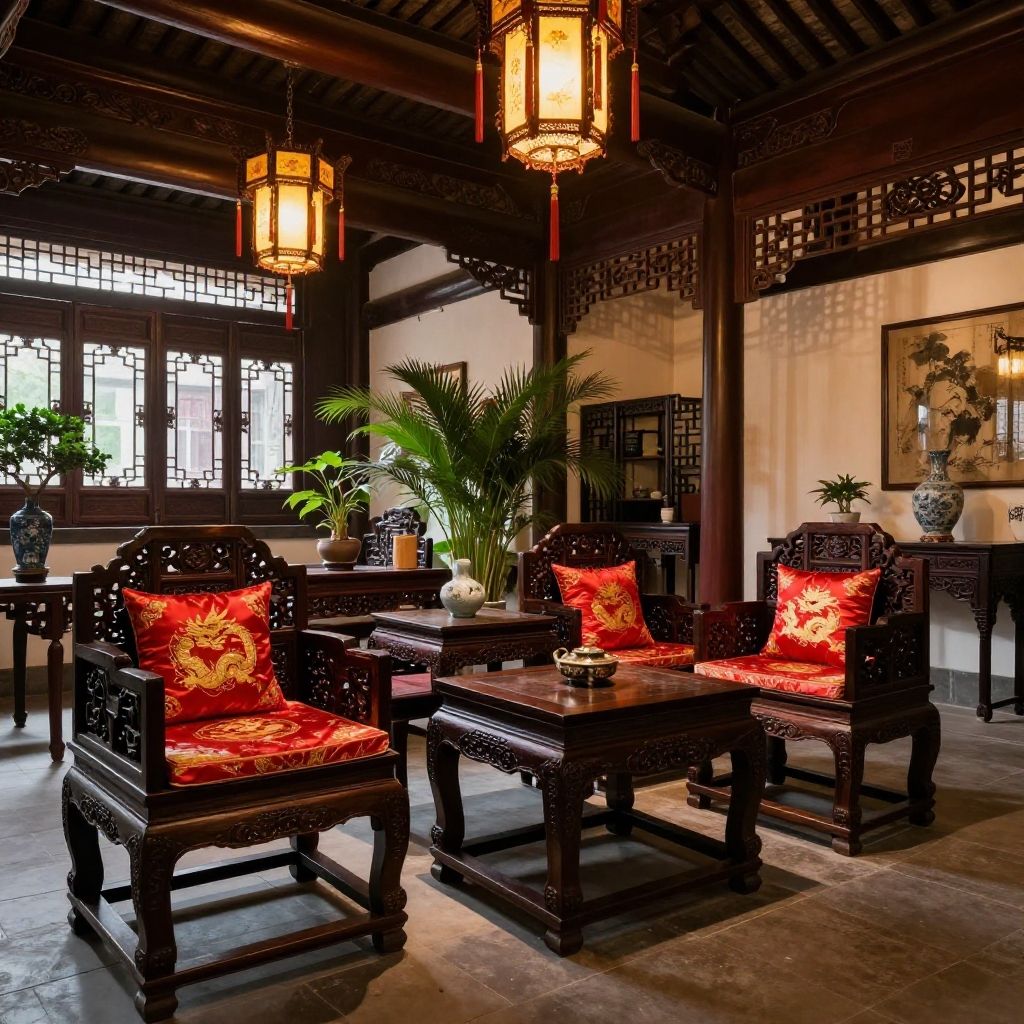 Photograph of an elegant traditional Chinese living room with dark wooden furniture, vibrant red patterned cushions, hanging lanterns, potted plants, and intricate