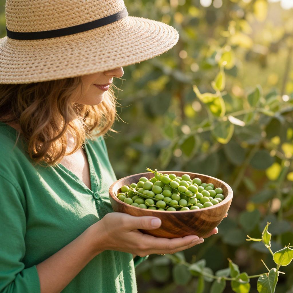 Sunlit garden scene captures a woman in a straw hat and green shirt, holding a wooden bowl brimming with vibrant green peas, surrounded by lush foliage and bathed in warm, golden sunlight filtering through the trees.