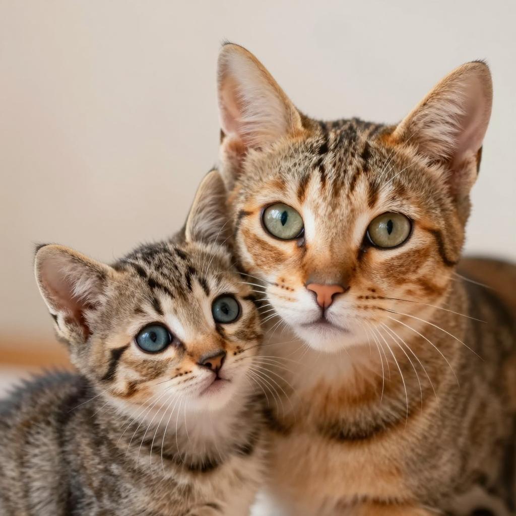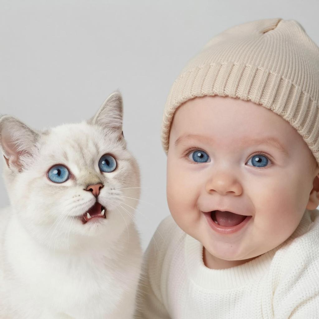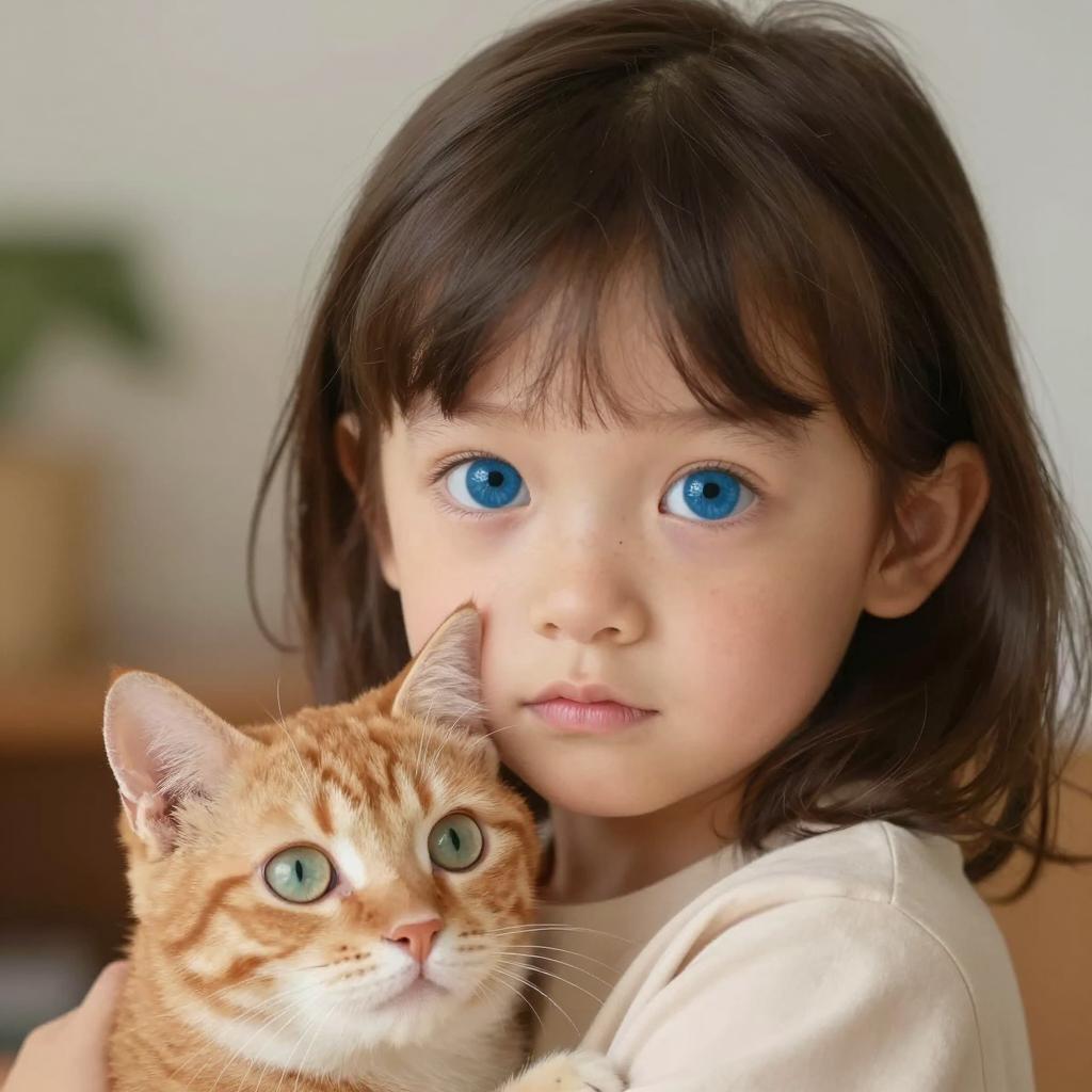 Digital illustration of a white dog with blue eyes and a small ginger cat with blue eyes. Dog has floppy ears, wears a blue collar with a small tag, sits beside cat. Both have soft, fluffy fur, lean against a rough wooden surface. Dog's nose is brown, cat's nose is pink. Background is blurred, beige, and ured. Dog's ear slightly touches cat's head. Both look directly at viewer.