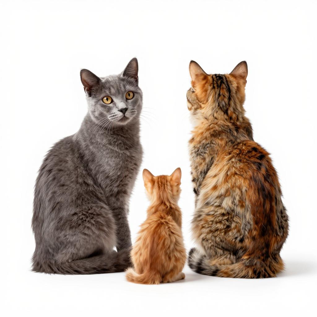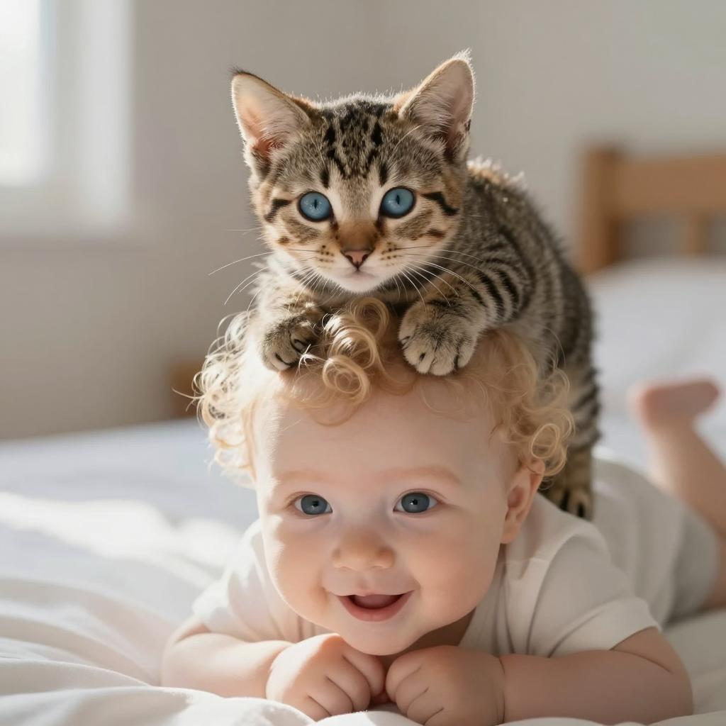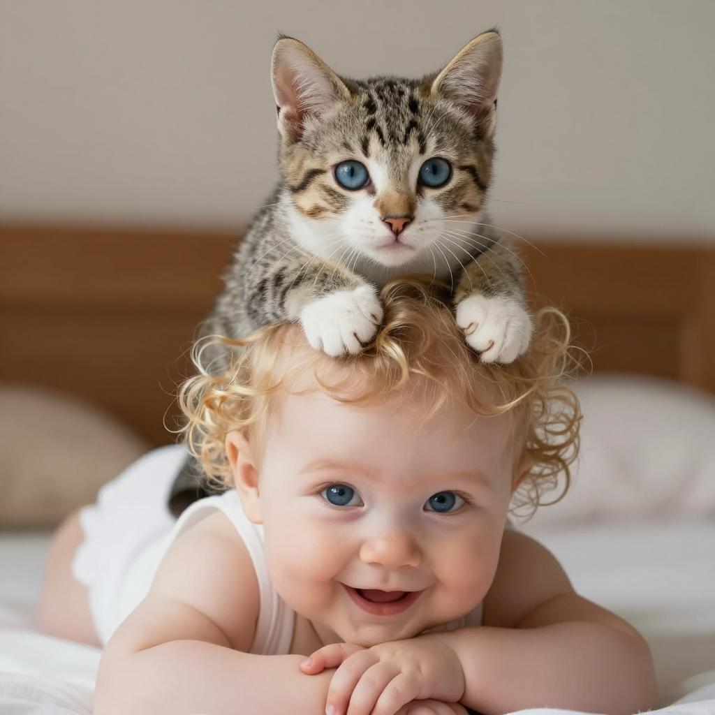Digital illustration of a white dog with blue eyes and a small ginger cat with blue eyes. Dog has floppy ears, wears a blue collar with a small tag, sits beside cat. Both have soft, fluffy fur, lean against a rough wooden surface. Dog's nose is brown, cat's nose is pink. Background is blurred, beige, and ured. Dog's ear slightly touches cat's head. Both look directly at viewer.
