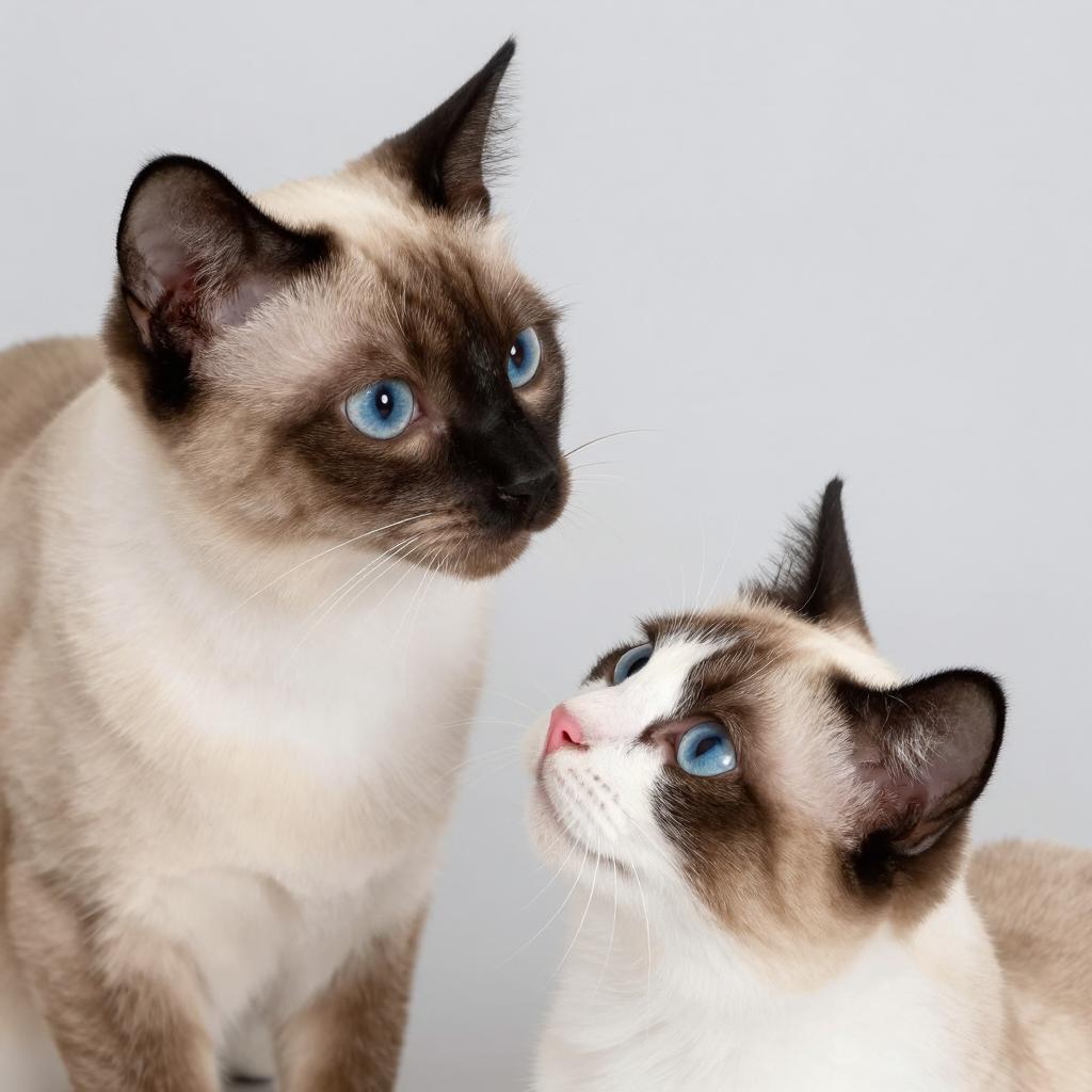 Digital illustration of a white fluffy dog with bright blue eyes, brown nose, and a blue collar sitting next to a small ginger cat with equally striking blue eyes and a pink nose. Both animals have soft, fluffy fur and are resting on a rough wooden surface, looking directly at the viewer. The background is blurred with beige tones, emphasizing the detailed features of the dog and cat.