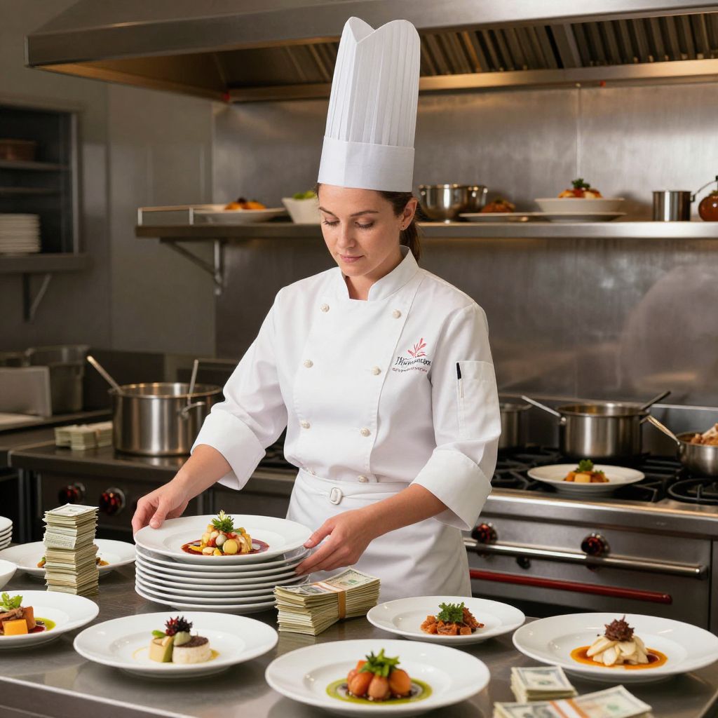 In the heart of a bustling kitchen, a chef stands amidst an array of culinary delights. She is adorned in a pristine white chef's uniform, complete with a tall, elegant hat that frames her focused expression. The chef's hands are deftly maneuvering a stack of plates, each bearing a delicate dish that exudes an air of sophistication. Surrounding her are stacks of money, symbolizing the success and elite status of her establishment. The kitchen itself is a symphony of textures and colors, with the gleaming surfaces of the cooking equipment contrasting against the soft, warm tones of the food. The chef's attention is unwavering, her gaze fixed on the task at hand, as if she is performing a dance with the ingredients, transforming them into masterpieces. The scene is a testament to her skill and dedication, capturing the essence of a chef at the peak of her craft, creating dishes that are not just food, but works of art.