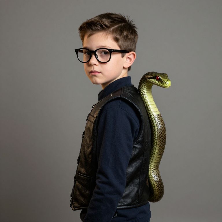 Photograph of a young Caucasian boy with short brown hair and black-framed glasses, wearing a black leather vest over a black shirt. He stands against a gray background, looking over his right shoulder. A realistic, green-scaled snake is coiled around his back, its head raised and facing forward. The boy's expression is neutral, and the lighting is even, highlighting the textures of his vest and the snake's scales. The image combines a realistic portrait style with a surreal element.