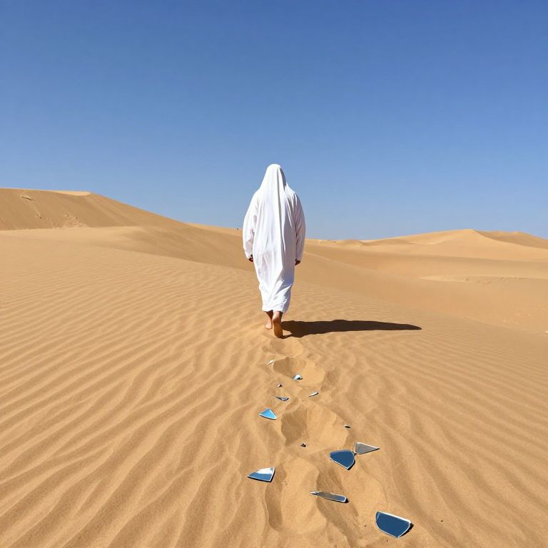 Wanderer cloaked in white walks alone through vast sand dunes, leaving a trail of shattered glass mirrors that scatter like ghostly confetti beneath a clear blue sky.