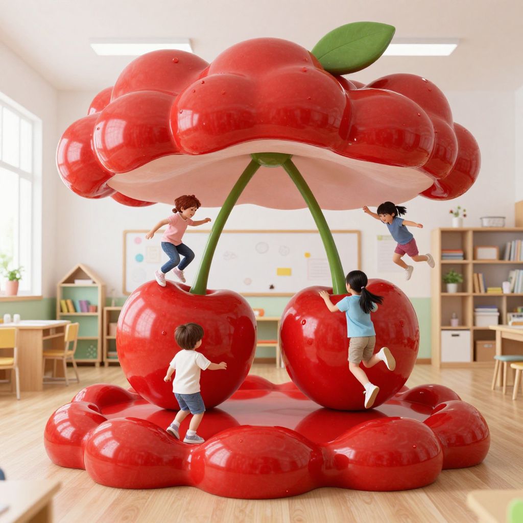 Photograph of four children playing on a giant, red inflatable cherry sculpture in a bright, modern classroom with wooden floors.