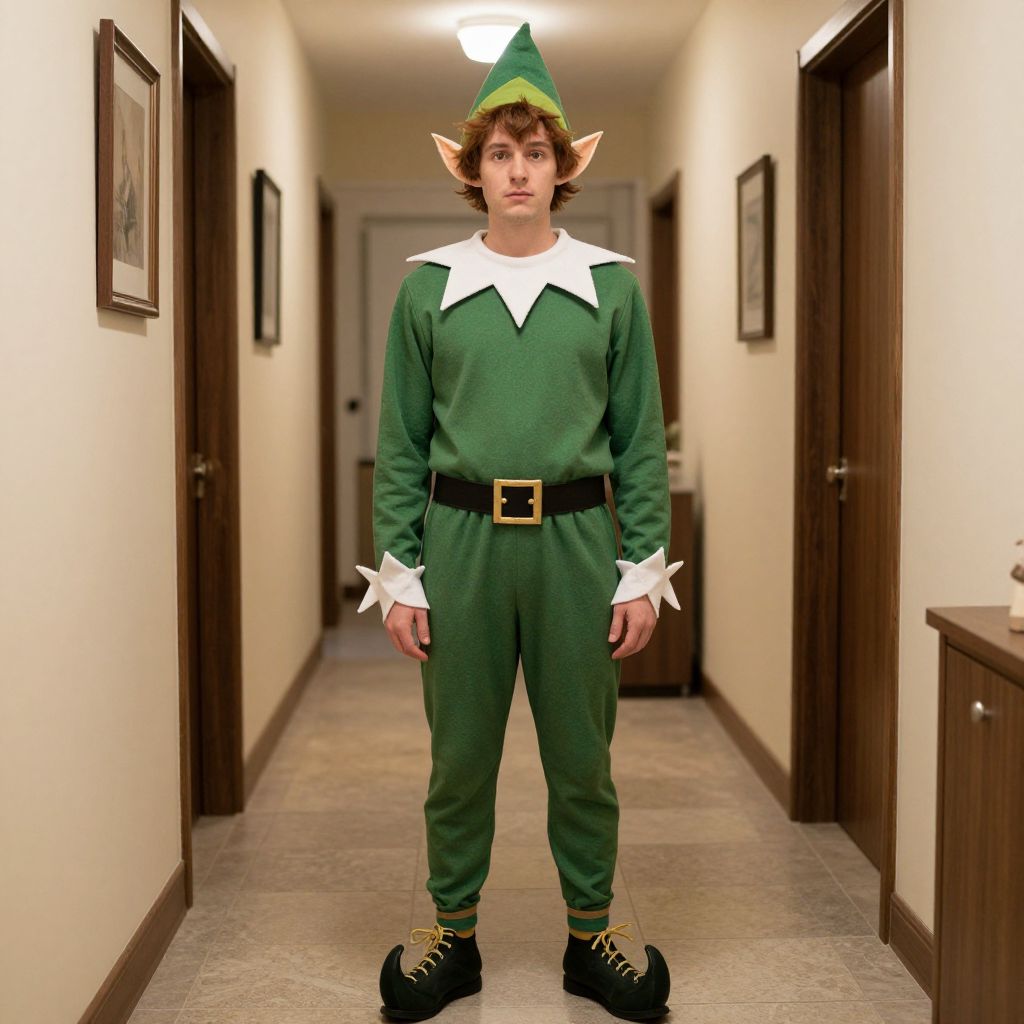 Photograph of a young man standing in a narrow, carpeted hallway with white walls and wooden doors. He wears a green elf costume with a pointed green hat, white collar, black belt with a square gold buckle, and black shoes with white laces. His brown hair peeks out from under the hat, and he has a neutral expression. The hallway features framed pictures on the left wall and a wooden cabinet on the right. The lighting is bright, casting even illumination throughout the space.