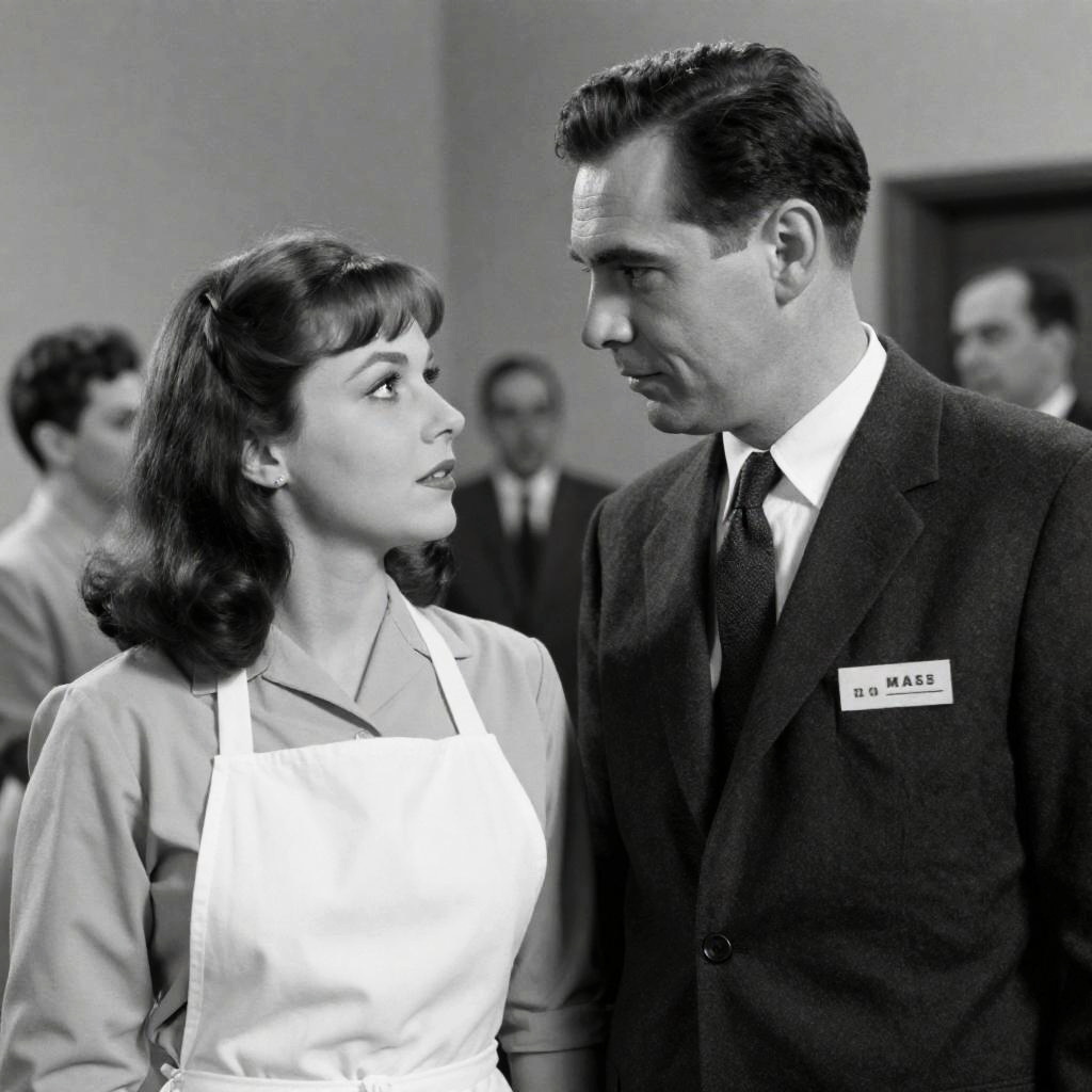 Movie poster of a man and woman standing close, facing each other. Man with blond hair, blue shirt, yellow shoulder straps, serious expression. Woman with dark hair, gray jacket, looking up at man, neutral expression. Green curtain background. Man on left, woman on right. Vivid colors, mid-20th century style.