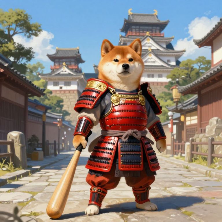 Digital artwork of a cute, brown and white Shiba Inu dog in traditional Japanese samurai armor, holding a wooden bat, standing on a sunny