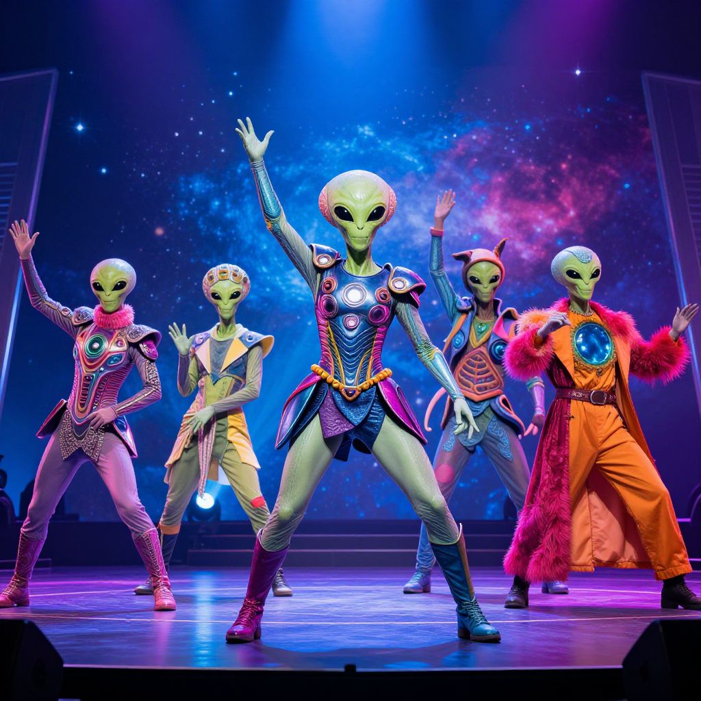 Aliens the musical AI scene with futuristic extraterrestrial performers on a neon-lit stage, vibrant alien costumes blending technology and theatrical flair, dynamic poses and cosmic background, cinematic lighting, digital art style.