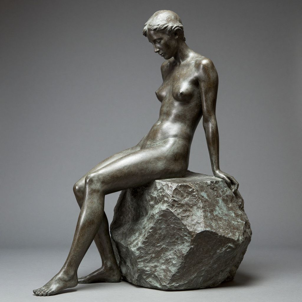 Photograph of a life-sized, bronze sculpture of a nude woman sitting on a large, textured rock. The sculpture has a realistic, yet slightly abstract style with smooth, flowing lines and a polished surface that reflects light. The woman has short, wavy hair, a slender build, small breasts, and is depicted in a three-quarter profile with her head slightly bowed and eyes downcast. Her right hand rests on the rock, while her left hand is on her lap. The background is a plain, gradient gray, emphasizing the sculpture's metallic sheen and intricate details.