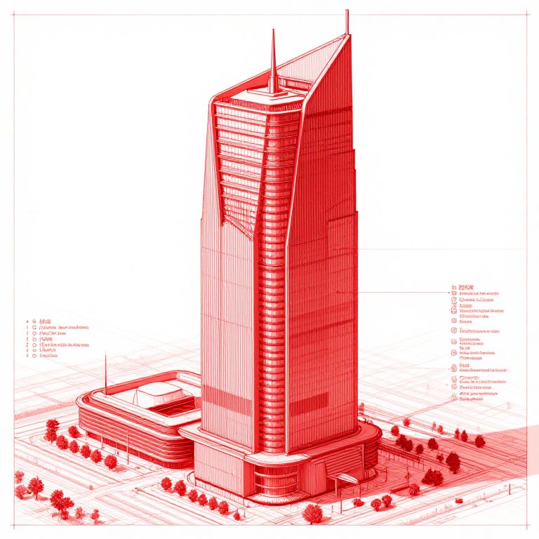 Layers detailed architectural drawing in red tones of a futurisric skyscraper. Red, detailed, blueprint, notes,