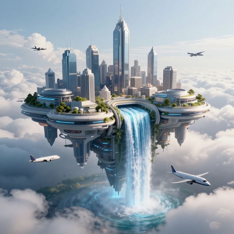This digital illustration depicts a futuristic, floating cityscape suspended in the sky, surrounded by fluffy white clouds. The city features towering skyscrapers with sleek, modern designs and reflective glass facades. A massive, cascading waterfall descends from the center of the floating landmass, creating a vibrant blue pool at the base. Several airplanes, including a larger jet and a smaller propeller plane, fly around the city. Greenery is scattered across the rooftops, adding a touch of nature to the urban environment. The sky is bright and clear, with sunlight illuminating the entire scene.