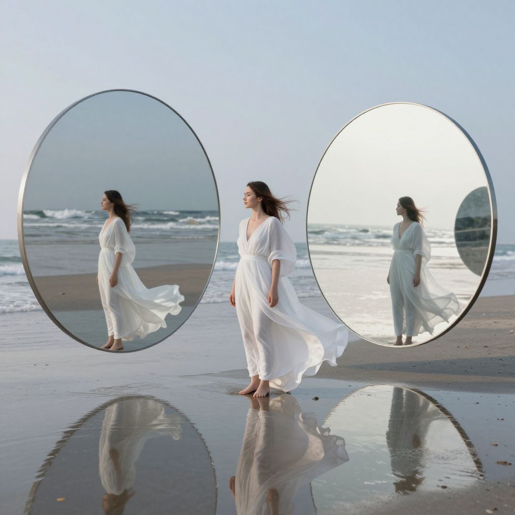 A surreal digital artwork captures a woman in a flowing white gown standing on a reflective beach, framed by two large circular mirrors that distort her image into ethereal reflections, evoking a dreamlike, cyberpunk-inspired vision of infinite, paradoxical realities.