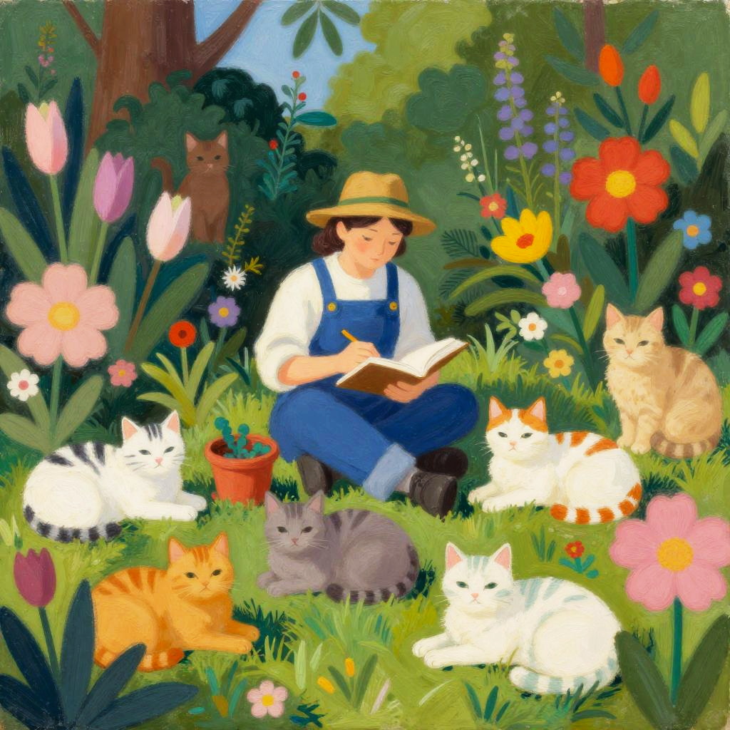 A gardener surrounded by an unreasonable amount of resting floral cats, in vivid psychedelic colors. Inspired by Arthur Frank Mathews, Alisa Burke, Anna Silivonchik, and Bill Bell.